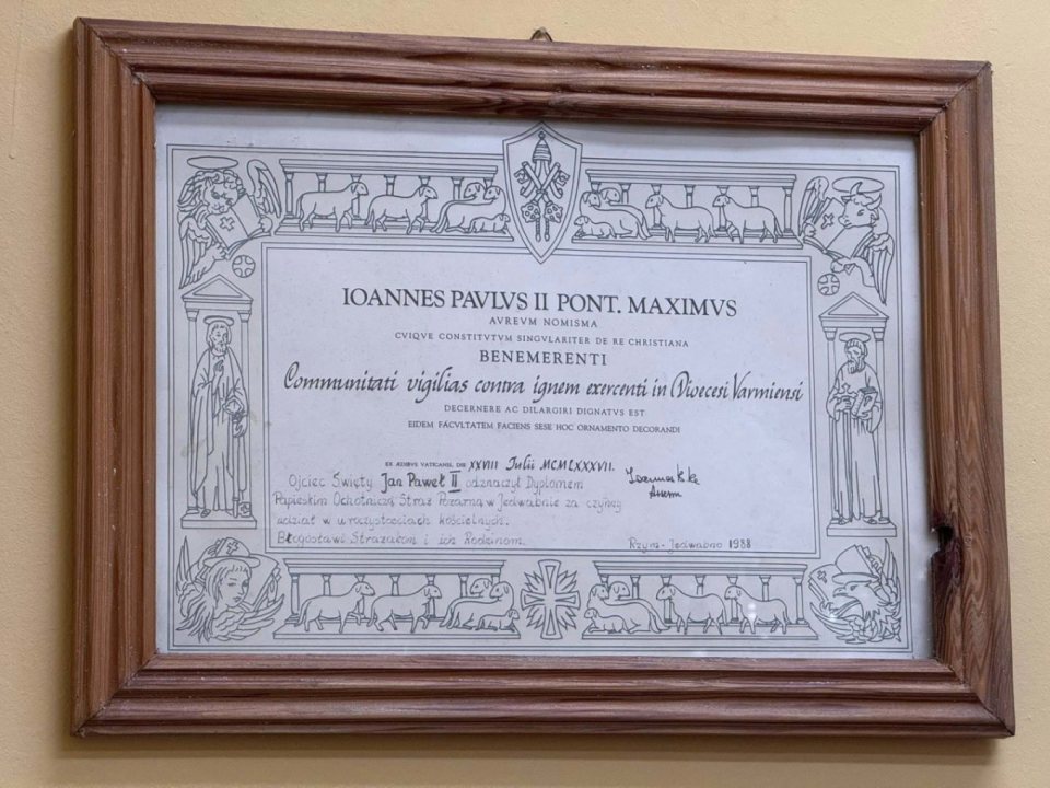 Podczas porządków w remizie druhowie z Ochotniczej Straży Pożarnej w Jedwabnie trafili na dokument, który przez lata leżał zapomniany. W ich ręce trafił papieski dyplom nadany przez Jana Pawła II. Dokument pochodzi z 1987 roku i dotyczy działalności jednostki w diecezji warmińskiej.