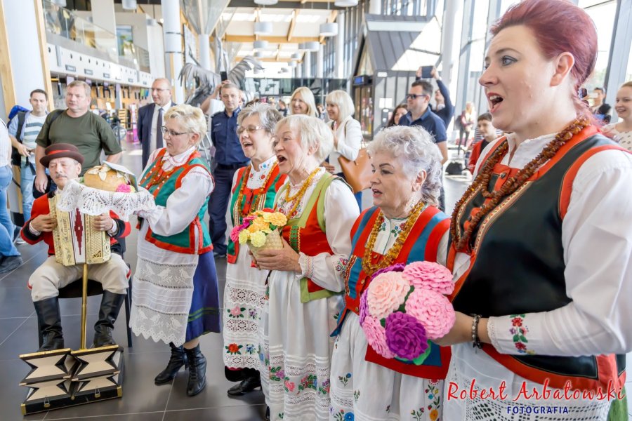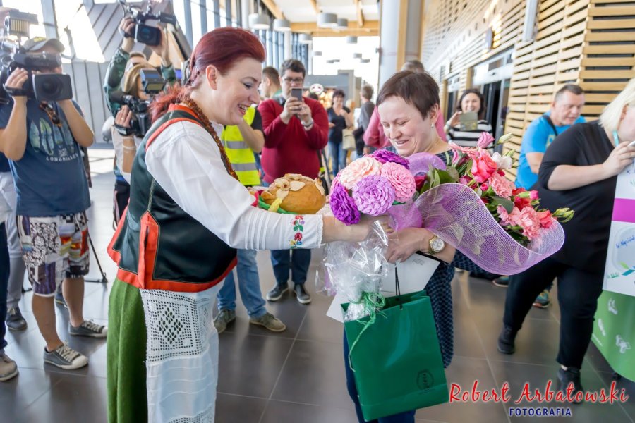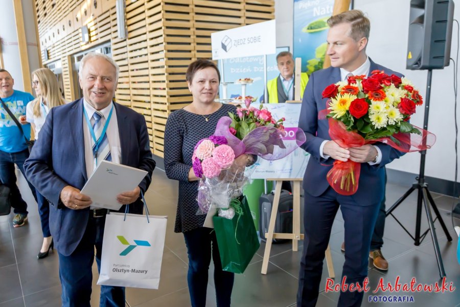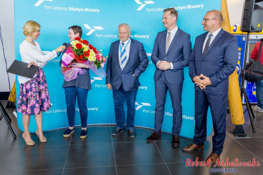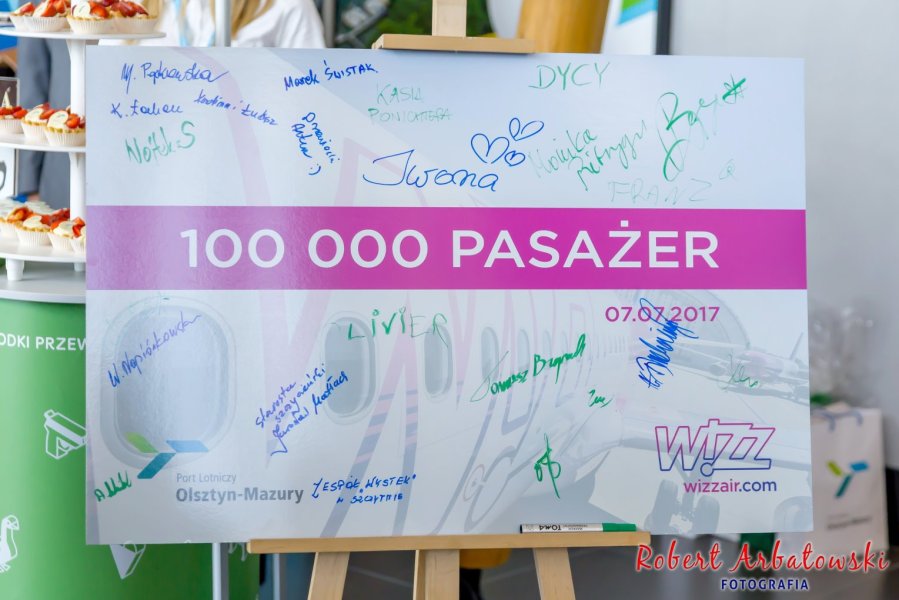 Według wcześniejszych wyliczeń, 100-tysięczny pasażer Portu Lotniczego Olsztyn-Mazury był przewidywany pod koniec lipca. Jednakże jubileuszowa uroczystość, ze względu na ilość sprzedanych biletów, odbyła się trzy tygodnie wcześniej. Sczęśliwym pasażerem okazała się mieszkanka Pisza - Małgorzata Bazydło, która do Szyman przyleciała z Oslo za pośrednictwem linii Wizzair. Władze Portu Lotniczego Olsztyn-Mazury wraz z liniami Wizzair ufundowały Małgorzacie Bazydło voucher na przelot w obie stronywspomnianą linią oraz vocher na pobyt w Hotelu Leśna w Szczytnie.