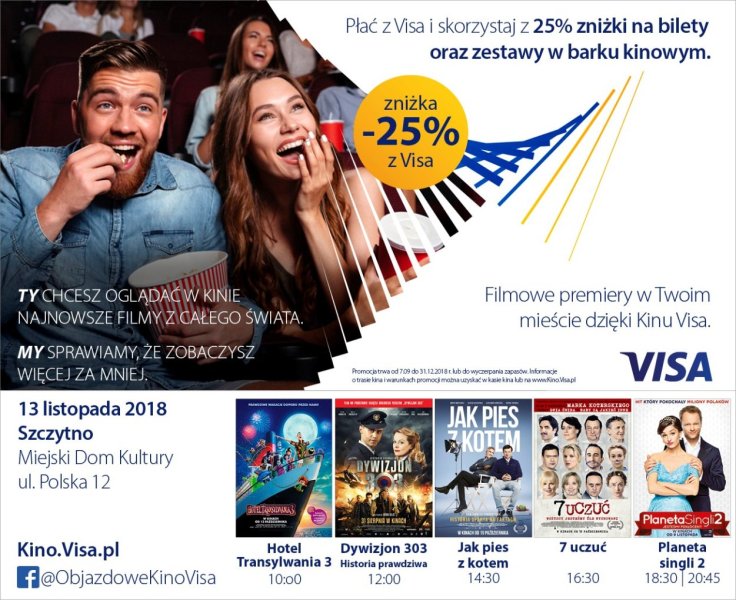 Objazdowe Kino Visa podróżuje po Polsce z najciekawszymi filmami i oferuje - specjalne promocje. Na wszystkich widzów czeka aż 25% zniżki przy płatności kartą Visa. Oferta obowiązuje przy zakupie biletów do kina i zestawów w barku kinowym.