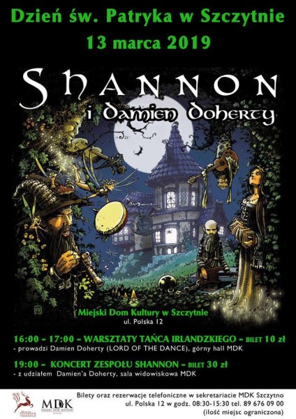 W środę, 13 marca odbędą się w Miejskim Domu Kultury w Szczytnie koncert zespołu Shannon oraz warsztaty tańca irlandzkiego z Damienem Doherty (Lord of The Dance). Wydarzenie odbędzie się w ramach dnia św. Patryka.
