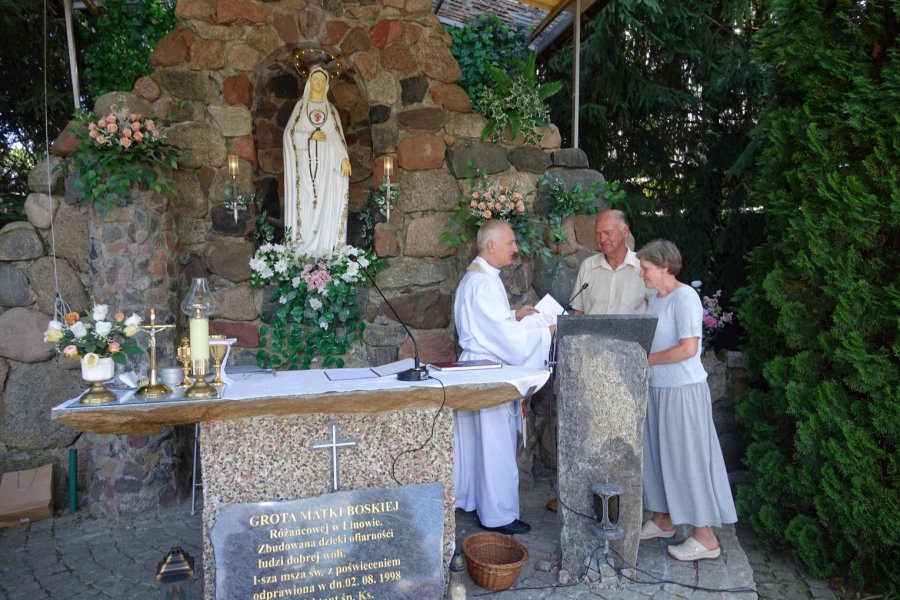 Dziękowała wszystkim darczyńcom, których przez lata uzbierało się wielu. Szczególne podziękowania złożyła w imieniu całej społeczności Linowa państwu Krystynie i Tadeuszowi Chorążewiczom, którzy od śmierci ks. Roberta (29 grudnia 2002 r.) praktycznie sami dbają o grotę: urządzają ją, koszą trawę, nawadniają, prowadzą nasadzenia kwiatów, konserwują i rozbudowują istniejące instalacje, dbają o nagłośnienie i należytą oprawę mszy, finansują bieżące remonty i rachunki za energię elektryczną (grota jest podświetlona przez cały rok). Wręczyła im też podziękowania, pod którymi po mszy podpisali się niemal wszyscy obecni.
