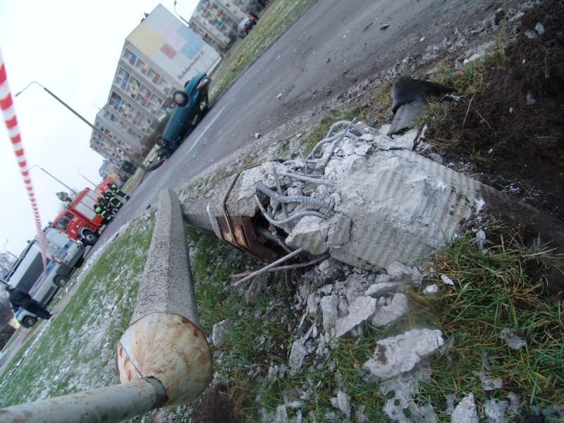 22-latek miał naprawdę sporo szczęścia, bo wypadek wyglądał niezwykle groźnie. Z potężnej, betonowej latarni niewiele zostało, tak samo jak z osobowej mazdy.