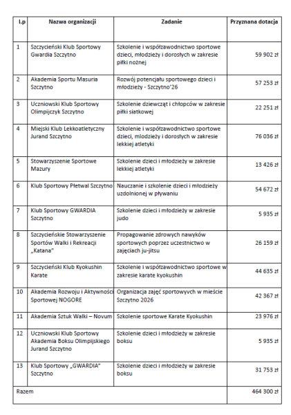 Środki trafią do 13 klubów i stowarzyszeń. Sprawdziliśmy, jakie zadania będą finansowane. Najwyższą dotację otrzymał MLKS Jurand Szczytno – 76 036 zł na lekkoatletykę. Wsparcie powyżej 50 tys. zł trafiło także do SKS Gwardia Szczytno, Akademii Sportu Masuria oraz Płetwala Szczytno.