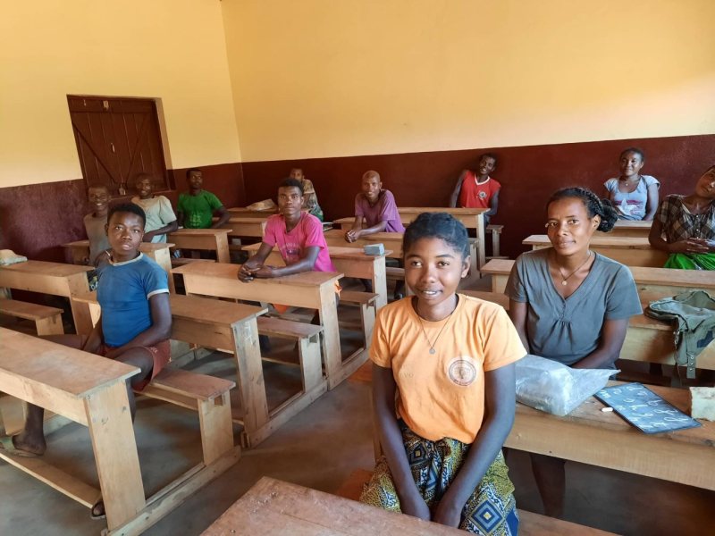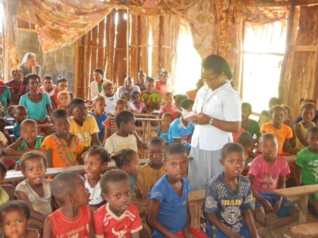 Siostra zakonna Iwona zaprowadziła Piórkowskich do szkoły, istniejącej w tej malgaskiej wsi. To był maleńki budynek z drewnianych bali, wielkości przeciętnego salonu w przeciętnym polskim domu. Uczyły się w nim nie tylko dzieci, ale i dorośli, bo analfabetyzm dominował wśród miejscowej ludności. Kryty strzechą budyneczek pełnił funkcję nie tylko szkoły, ale i schronienia, bo podczas pory deszczowej wieś była zalewana, dosłownie pływała.