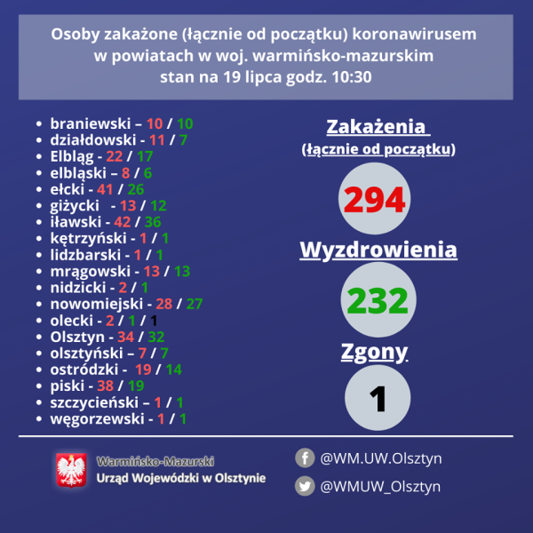 📊 Dzienny raport o #koronawirus Wykaz zakażonych i wyzdrowiałych woj. W-M stan na 26 lipca godz. 12:30
