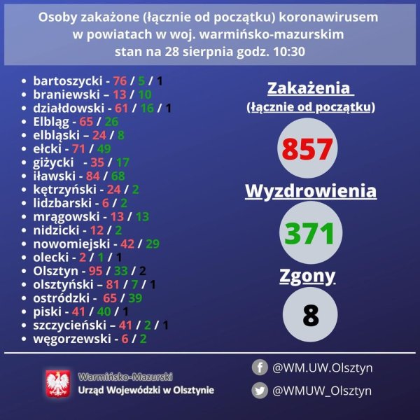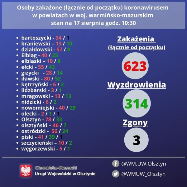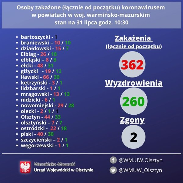 📊 Dzienny raport o #koronawirus Wykaz zakażonych i wyzdrowiałych woj. W-M stan na 31 lipca godz. 10:30