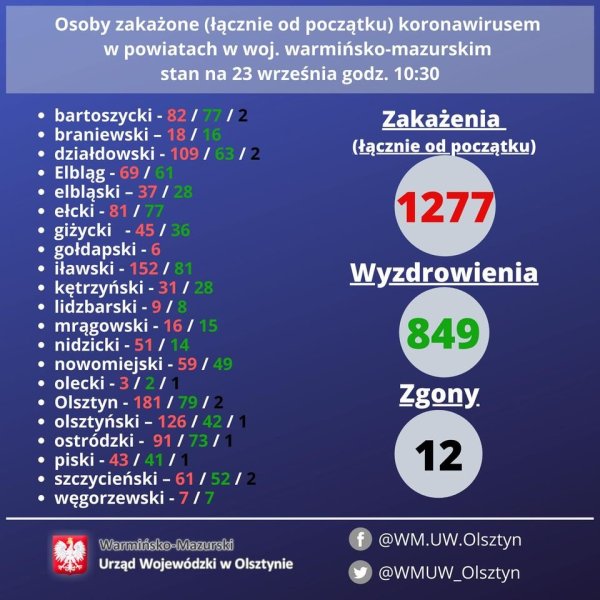 📊 Dzienny raport o #koronawirus Wykaz zakażonych i wyzdrowiałych woj. W-M stan na 23 września godz. 10:30