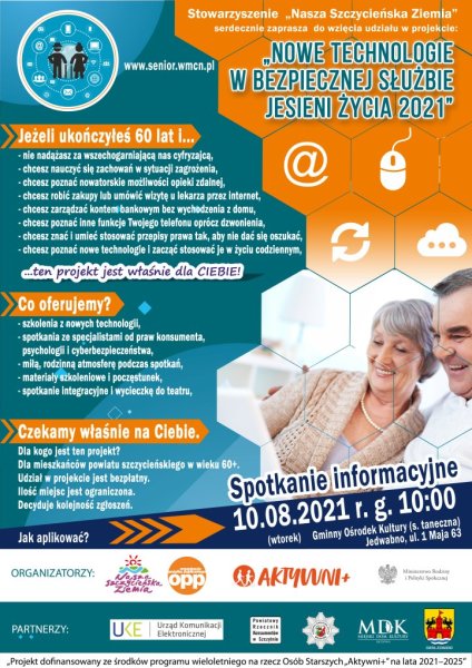 Stowarzyszenie Nasza Szczycieńska Ziemia jest w trakcie realizacji projektu pn. „Nowe technologie w bezpiecznej służbie jesieni życia 2021”, skierowanego do osób w wieku 60+ z terenu pow. szczycieńskiego. Jednym z jego elementów jest cykl bezpłatnych zajęć poświęconych szeroko pojętemu bezpieczeństwu seniorów. Choć zajęcia odbywają się w Szczytnie od początku lipca, organizatorzy zapraszają również mieszkańców Gminy Jedwabno. Uczestnicy zakwalifikowani do udziału w projekcie mogą liczyć na dodatkowe atrakcje. O szczegółach opowiada nam wolontariusz projektu - Rafał Szumny.