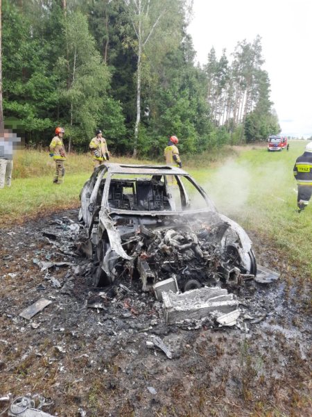 - Gdy nasze zastępy dojechały na miejsce wezwania, samochód był objęty w całości ogniem – mówi kapitan Łukasz Wróblewski z KP PSP w Szczytnie.