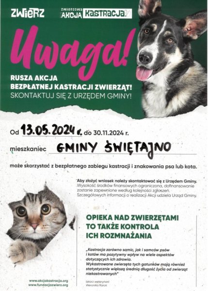 Od 13 maja mieszkańcy gminy Świętajno mogą skorzystać z bezpłatnego zabiegu kastracji i znakowania swoich psów i kotów. Akcja potrwa do 30 listopada. Jej celem jest kontrola populacji zwierząt domowych oraz poprawa ich zdrowia.