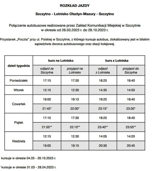 Pojawił się właśnie rozkład jazdy autobusów ze Szczytna do Portu Lotniczego Olsztyn-Mazury. Połączenia mają być realizowane od 28 marca do 28 października. To ważna informacja głównie dla turystów i osób korzystających z portu lotniczego w Szymanach. Przystanek odjazdowy znajduje się przy poczcie, w sąsiedztwie dworca PKS i PKP. Szczegóły plakacie.