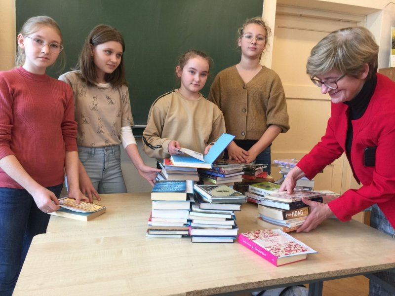 Książki podarowali wicedyrektorzy szkoły: Renata Pikura i Ewa Żenczykowska-Sawicka oraz Barbara Pietrzak, uczniowie koła kreatywnego "Radośni plastycy" i "Szczęśliwi malarze" z opiekunem Elżbietą Białczak, uczniowie z klas starszych z wychowawcami: 5a z Justyną Kocenko, 8e z Jolantą Matejko, 6a z Urszulą Jankowską oraz uczniowie z klas 4-8.