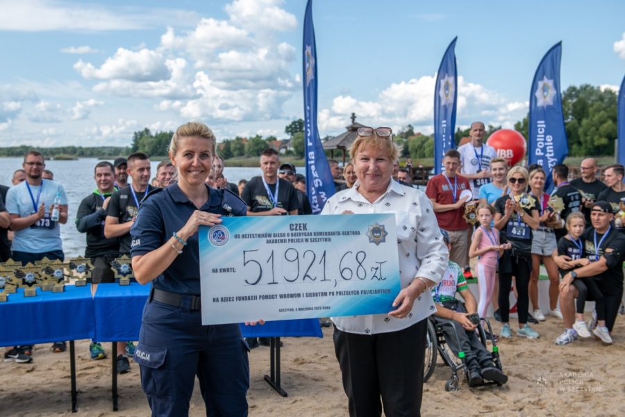 Na zakończenie Biegu głos zabrała Pani nadinsp. dr hab. Iwona Klonowska. Pani Komendant-Rektor podziękowała wszystkim tym, którzy przyczynili się do organizacji tego Biegu m.in. sponsorom – bez których nie udałoby się przygotować pakietów startowych, a przede wszystkim uczestnikom – bez których nie udałoby się zebrać tak zawrotnej kwoty – 51 921,68 zł, które trafią na konto Fundacji. Pani Generał dokonała również symbolicznego przekazania czeku, który odebrała osobiście Pani mł. insp. w st. spocz. Irena Zając – Prezes Zarządu Fundacji Pomocy Wdowom i Sierotom po Poległych Policjantach.