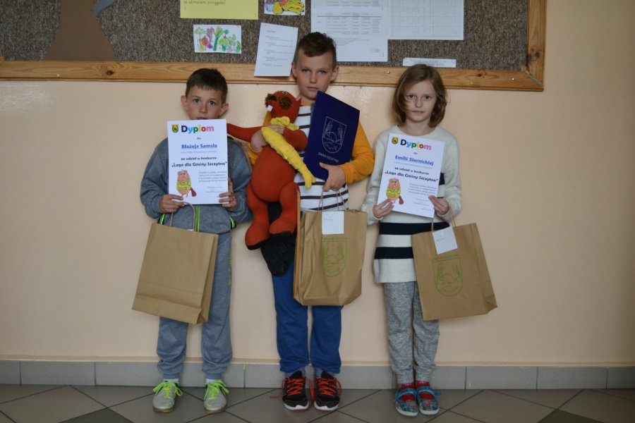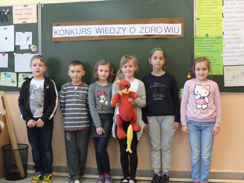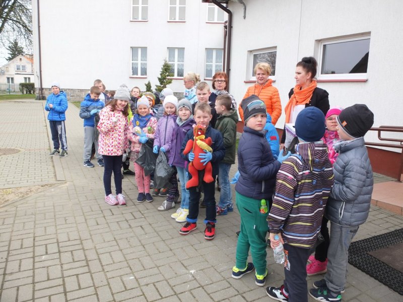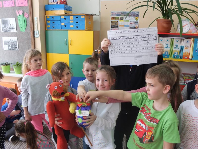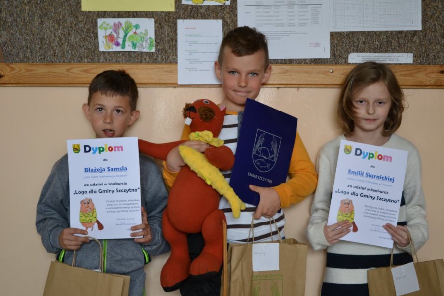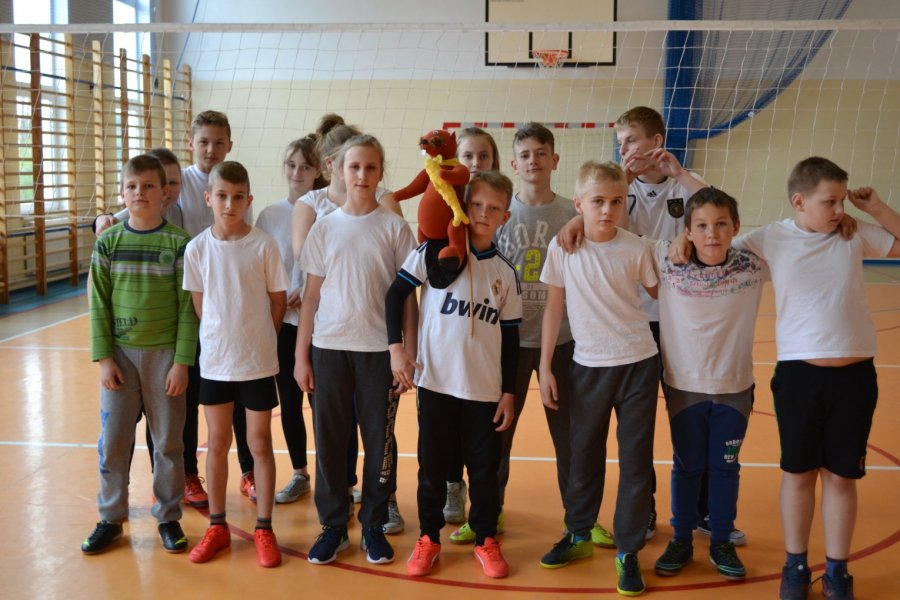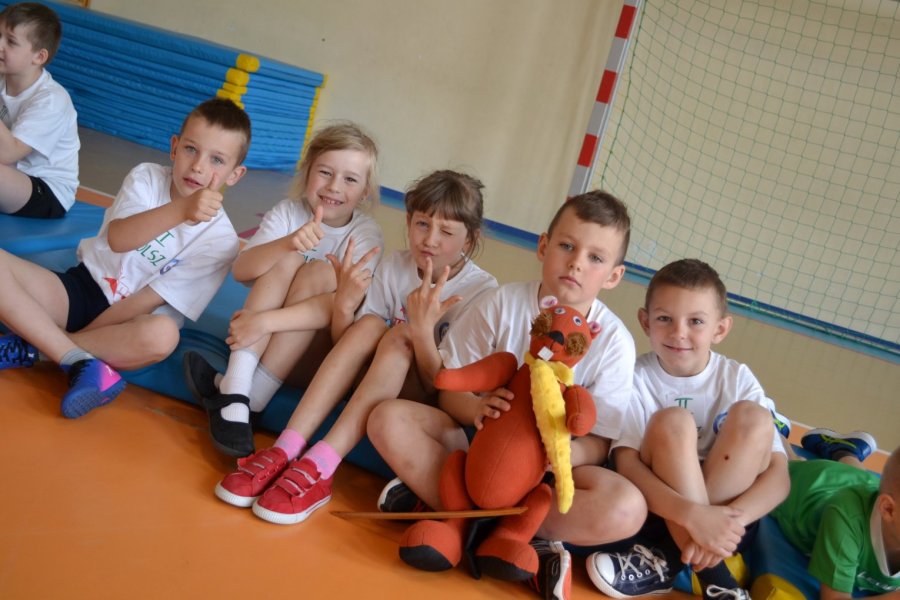 Po wycieczce nie daliśmy odpocząć naszemu gościowi. Zaprosiliśmy go na konkurs wiedzy o zdrowiu. Pytania były niezwykle trudne, a nasz gość znał odpowiedzi na niektóre z nich. Laureaci konkursu z klas II-III otrzymali nagrody na apelu podsumowującym Tydzień Kultury Ekologiczno- Zdrowotnej. Wręczono również nagrody tym, którzy wyróżnili się w konkursie plastycznym „Jak dbam o swoje środowisko?” Bóbr Gminek czynnie wspierał dzieci w plastycznej działalności i nawet wiedział jak się segreguje śmieci. Temat ekologii nie jest obcy naszym dzieciom. Przez cały rok zbierają makulaturę i nakrętki. Szczególnie liczba zebranych nakrętek zrobiła na Bobrze duże wrażenie. Z dumą rozsiadł się na górze nakrętek i pozował do zdjęć. Ale to nie koniec tematu ekologii. Nie lubimy gdy inni śmiecą, dlatego wspólnie z naszym gościem wyruszyliśmy w teren, aby posprzątać Warmię i Mazury. Trochę tego było… Gminek był zadowolony, bo też lubi porządek. Dbamy nie tylko o środowisko, ale nie zapominamy też o potrzebujących. Postanowiliśmy wspomóc Roberta Rekosza, który pochodzi ze Szczytna i ze względu na ciężką chorobę potrzebuje pomocy. Przeprowadziliśmy kwestę wśród uczniów i pracowników szkoły. Bóbr przeliczył, że zebraliśmy 207 złotych. Przekazaliśmy je na konto pana Roberta. Bóbr Gminek był wzruszony, że ofiarowaliśmy pieniądze z naszego kieszonkowego. Aby być zdrowym trzeba dużo ćwiczyć. Postanowiliśmy rozruszać Gminka. Wspólnie z uczniami klas I-III brał udział w Gminnym Turnieju Małych Sportowców. Gościliśmy uczniów z czterech szkół. Starał się kibicować wszystkim zawodnikom, ale kciuki trzymał za nas. Wspólnie z dyrektor Grażyną Kacprzyk wręczał puchary, medale i dyplomy.