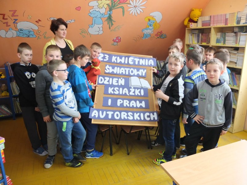 Kiedy nasz gość pojawił się w szkole zbiegły się wszystkie dzieci, aby go powitać. To był dopiero początek naszej znajomości, która pod koniec pobytu przerodziła się w przyjaźń. I tak zaczęła się nasza współpraca. Najpierw zwycięzca konkursu pięknego czytania odwiedził oddział przedszkolny, aby pochwalić się swoimi umiejętnościami. Bóbr Gminek wspólnie z przedszkolakami z dużym zainteresowaniem wysłuchali bajki, którą przepięknie przeczytał nasz mistrz Bartosz Cichy z klasy III. Ale to nie był koniec czytelniczych atrakcji, bo następnego dnia spotkaliśmy się ze znanymi i lubianymi postaciami z bajek, które porwały nas do wspólnej zabawy. Oczywiście nasz gość nie pozostał w tyle i pląsał razem z nami. Nasi uczniowie od wielu lat biorą udział w programie „Cała Polska czyta dzieciom”, a w tym roku poszerzyliśmy go o program „Z książką przez świat”. Niedługo, bo 24 kwietnia, ponownie odwiedziliśmy bibliotekę. Nasza wizyta związana była ze Światowym Dniem Książki i Praw Autorskich, który był obchodzony 23 kwietnia. Pani Jola Bogacka poinformowała gości ,dlaczego święto jest ważne i co ma na celu.