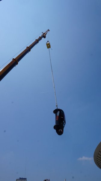 Dźwig, 80 metrów wysokości, do gumowej liny podczepiony renault clio, w aucie Bogdan Kopka i Arkadiusz Klepacki ze Szczytna. Ten skok na bungee przejdzie do historii. Był główną atrakcją targów motoryzacyjnych w Katowicach. Auto z naszymi mieszkańcami zatrzymało się dosłownie dwa metry przy ziemi. - Niesamowite emocje – mówi Bogdan Kopka, specjalista od ekstremalnych wydarzeń.