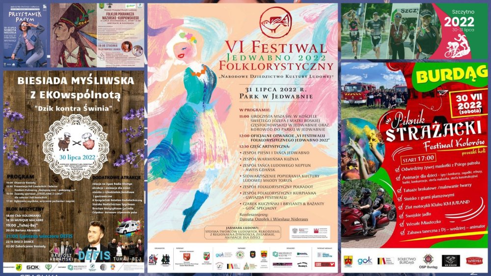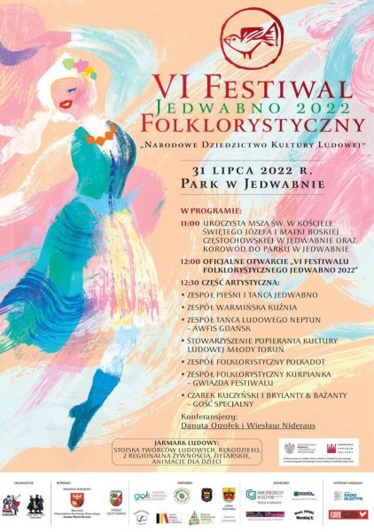 Niedziela, 31 lipca, Jedwabno. Wystąpią: Zespół Pieśni i Tańca JEDWABNO, Warmińska Kuźnia, Zespół Tańca Ludowego NEPTUN – AWFiS Gdańsk, Stowarzyszenie Popierania Kultury Ludowej MŁODY TORUŃ, Zespół Folklorystyczny PolkaDot, Zespół Folklorystyczny KURPIANKA z Kadzidła (gwiazda festiwalu).