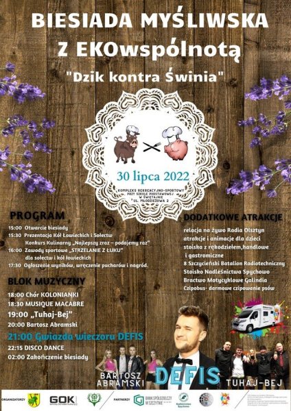 Sobota, 30 lipca, Świętajno, godz. 15:00 - Największa i najbardziej znana impreza w Świętajnie - Dzik kontra świnia. W programie biesiada, prezentacje kół łowieckich, występy muzyczne.