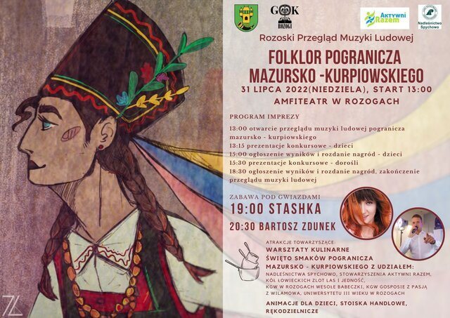 Niedziela, 31 lipca, amfiteatr w Rozogach, godz. 13:00 - Przegląd Muzyki Ludowej. Koncerty: 19:00 Stashka, 20:30 Bartosz Zdunek.