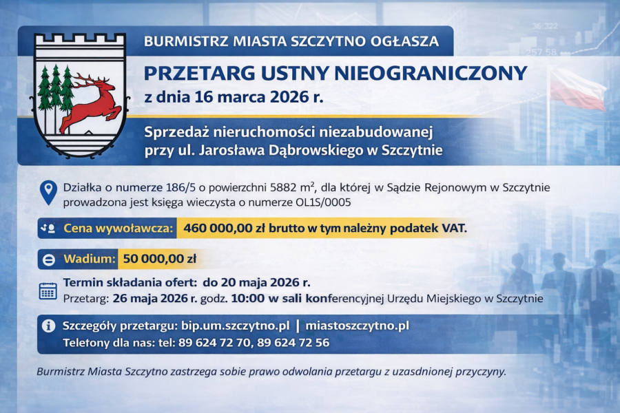 Przetarg zostanie przeprowadzony w dniu 26 maja 2026 r. o godzinie 10:00 w sali konferencyjnej Urzędu Miejskiego w Szczytnie.