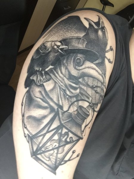 Następny tatuaż powstał na ramieniu, nad skalpelem. Nosi nazwę: „Doktor zaraza”. To lekarze, którzy podczas różnych plag – epidemii, od XVII wieku, udzielali pomocy nosząc na twarzach maski w kształcie ptasiego dzioba. W tych maskach mieli różne zestawy ziół, które miały chronić lekarza przez zarażeniem. Można powiedzieć, że były to pierwsze maski gazowe. Na ramieniu mam właśnie takiego lekarza – zarazę, a właściwie tylko jego popiersie. Ten tatuaż powstał w 2017 roku, również na konwencie tatuażystów, a jego autorką jest Karolina Myćka z Krakowa. Ostatni posiadany tatuaż, na drugim ramieniu, to scena z „Pulp fiction”, bo jestem fanem tego filmu. Powstał niedawno, w 2019 roku.