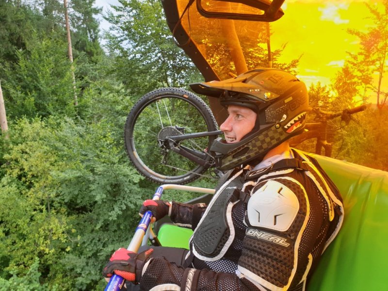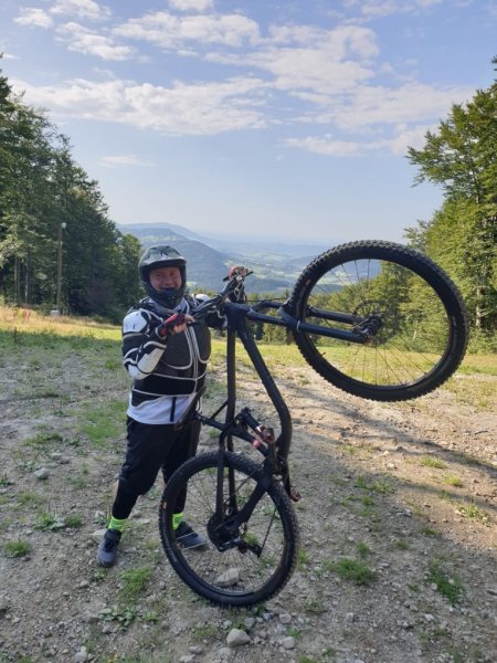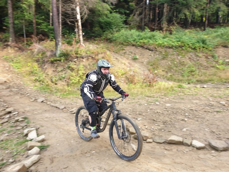 To jest hobby bardzo jeszcze amatorskie, którym zaraził mnie nie tak dawno kolega z pracy. Jeździmy rowerami enduro, przystosowanymi głównie do jazdy w górach. Jeździmy głównie po torze, specjalnie zbudowanym w Leśnym Dworze – Szczytno MTB Trails. To dwie trasy różnej długości. To naprawdę ciekawe trasy: z podjazdami i zjazdami, z kilkoma różnymi przeszkodami itp. Są znane nie tylko w Szczytnie, oczywiście wśród miłośników takiego właśnie kolarstwa, ale także poza naszym terenem. Przyjeżdżają np. ludzie z Gdańska, by z tych tras skorzystać. My z z kolei jeździmy w góry, np. rok temu byliśmy w Bielsku Białej. Tam jest specjalny wyciąg, którym wraz z rowerem wjeżdża się na górę, a później, już rowerem, z niej zjeżdża. Przy końcu prędkość jest już spora, może sięgać nawet 60 km/h, więc robi się już ekstremalnie. Trzeba mieć odpowiedni strój: tzw. zbroję, kask...