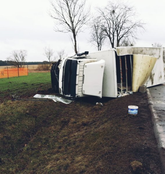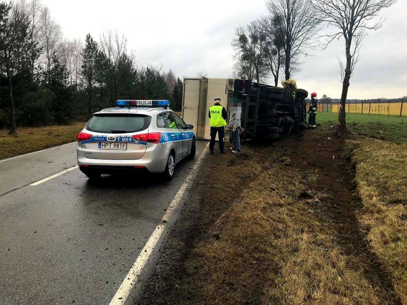 Na trasie Lemany – Stare Kiejkuty ciężarowe volvo wjechało do rowu i przewróciło się. Autem kierował 46-letni mężczyzna. Najprawdopodobniej nie dostosował prędkości do warunków panujących na drodze. Kierowca oraz 36-letni pasażer nie odnieśli żadnych obrażeń. Ruch na DK-58 odbywał się wahadłowo.