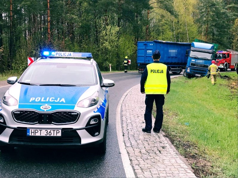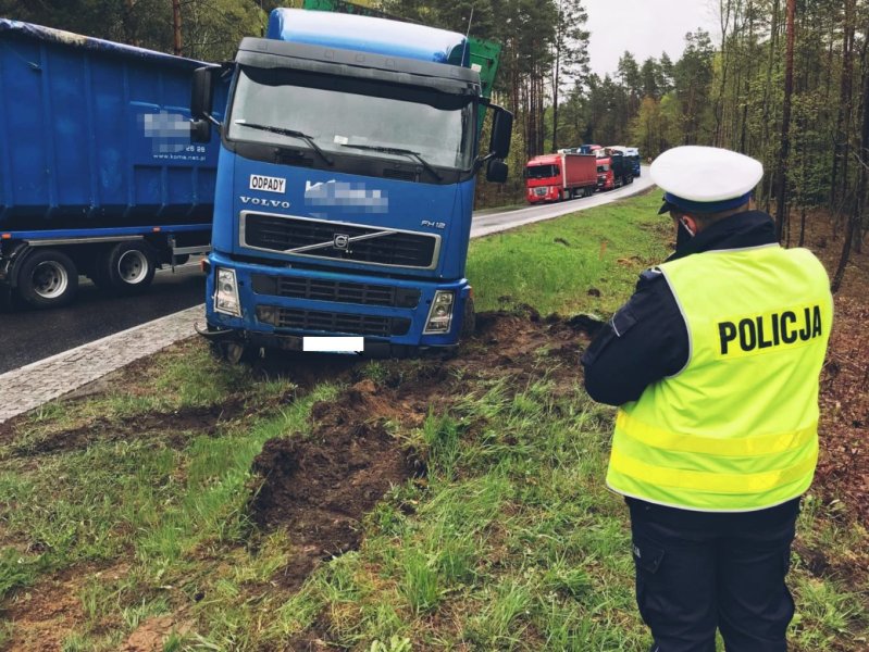 Do zdarzenia doszło, we wtorek, 5 maja około godziny 13. Ze wstępnych ustaleń funkcjonariuszy pracujących na miejscu zdarzenia wynika, że 34-letni mieszkaniec powiatu ełckiego, nie dostosował prędkości do warunków panujących na drodze, jego auto wpadło w poślizg i „złapało pobocza”. W wyniku tego manewru ciężarowe volvo zablokowało oba pasy ruchu. Kierowca nie doznał żadnych obrażeń ciała. Był trzeźwy.
