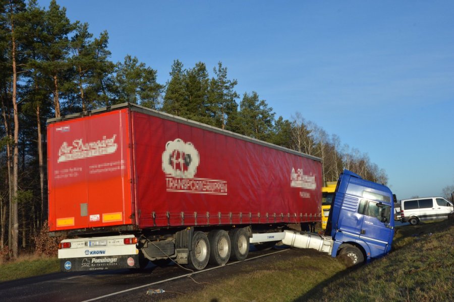 W okolicach wsi Jęcznik do rowu wjechał TIR. Auto zablokował dwa pasy jezdni. Na miejscu pracują policjanci oraz pracownicy firmy, którzy próbują wyciągnąć ciężarówkę z rowu.