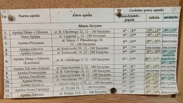 - Jakie nocne dyżury? - pyta retorycznie Tomasz Sienkiewicz. - Nie tak dawno, na tablicy ogłoszeń przy rejestracji do szpitalnych przychodni, widniała informacja, że te dyżury są do północy, a później od 6 rano. Dziś (wtorek, 19 kwietnia – przyp. H.B.) tej akurat kartki nie ma, ale jest informacja o tym, w jakie dni które apteki są czynne. Zgodnie z tą informacją, aptek w Szczytnie jest 13, a wiele z nich w soboty pracuje prawie normalnie.