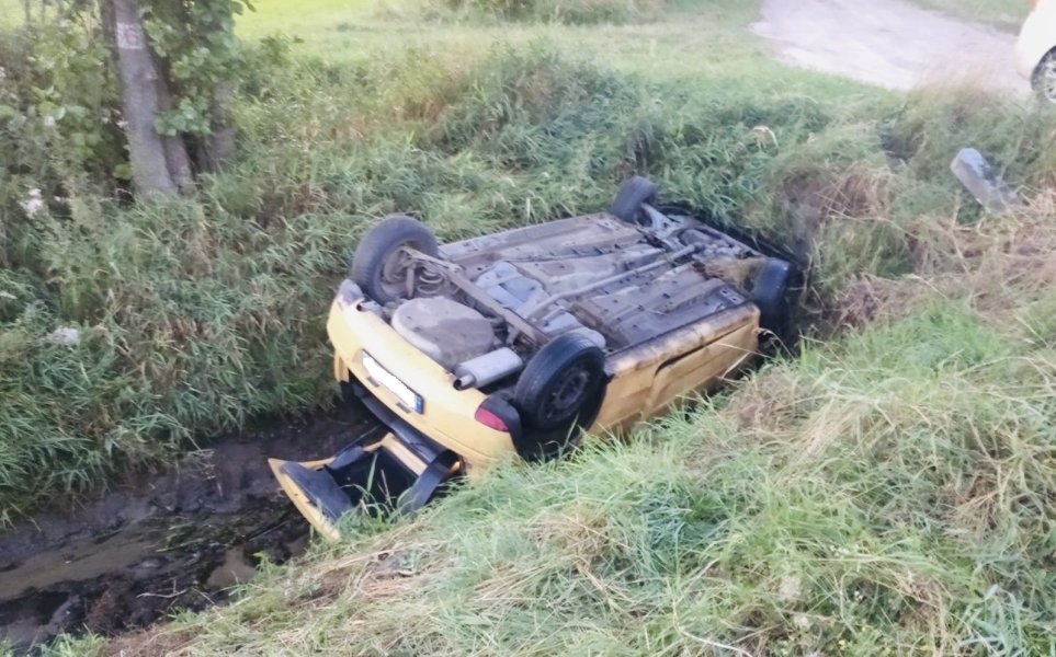 Opel corsa kierowany przez 63-letniego mężczyznę wylądował w rowie i na dachu na trasie Orzeszki – Klon. Kierowca został zakleszczony w samochodzie. Pomocy udzielili mu policjanci, którzy... przypadkowo najechali na kraksę.