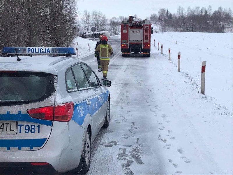 - Kierujący pojazdem ciężarowym 46-latek, mieszkaniec województwa podlaskiego, poruszając się na łuku drogi w stronę Gromu nie dostosował prędkości do warunków pogodowych, stracił panowanie nad pojazdem i zjechał do rowu - mówi sierżant Izabela Cyganiuk, rzecznik KPP Szczytno. - Na chwile obecną, ze względu na to, że w cysternie przewożony jest propan-butan działania przejęli strażacy.