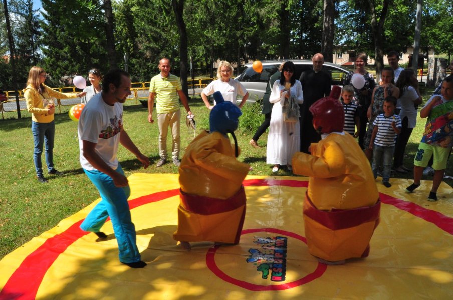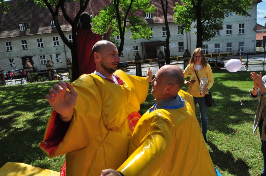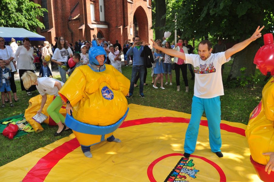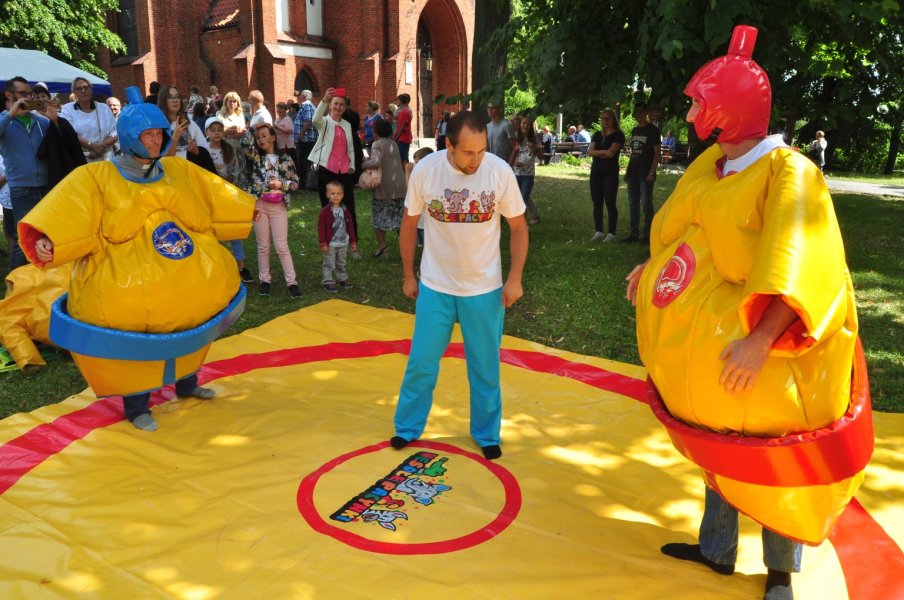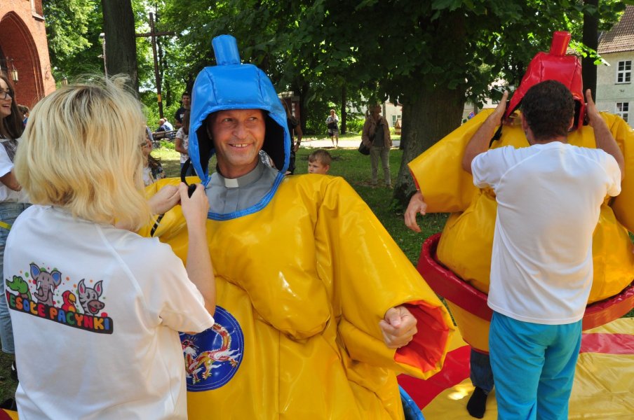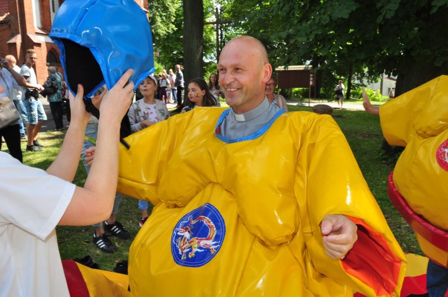 Co najmniej równie zabawny był czas, gdy sutanna, tym razem należąca do proboszcza parafii, ks. Andrzeja Preussa, zniknęła pod ogromnym strojem zawodnika sumo. Walka „potężnych” choć napompowanych zawodników była zacięta, ale nie jej wynik jest istotny, a to, że tej pogodnej niedzieli mnóstwo dzieci, z rodzicami, babciami, dziadkami, ciociami i kim tam jeszcze – wspólnie spędzili kilkadziesiąt minut świetnie się bawiąc. Oby więcej takich inicjatyw w Szczytnie.