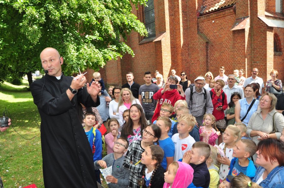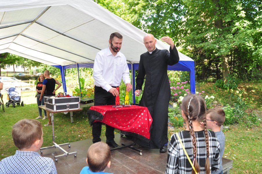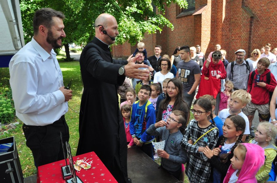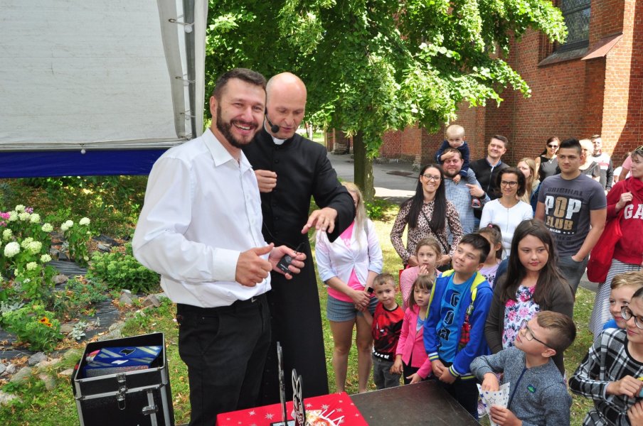 Ksiądz parający się magią?! Przed wiekami spłonąłby na stosie, ale w w XXI wieku świetnie bawił dzieci i dorosłych. Sztukmistrz z niebagatelnymi umiejętnościami był gościem kolejnego, niedzielnego pikniku rodzinnego w parafii WNMP. Co najmniej równie zabawny był czas, gdy sutanna, tym razem należąca do proboszcza parafii, ks. Andrzeja Preussa, zniknęła pod ogromnym strojem zawodnika sumo.