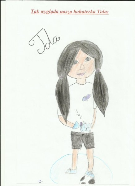 „Cześć, jestem Tola. Mam 9 lat. Chodzę do klasy trzeciej. Jestem dziewczynką średniego wzrostu. Mam długie, czarne włosy, które lubię wiązać w dwa kucyki. Uwielbiam chodzić w białej bawełnianej koszulce z kotkiem i krótkich spodenkach. Na nogi zakładam najwygodniejsze na świecie trampki. Lubię grać w piłkę i wspinać się na drzewa.(…)”