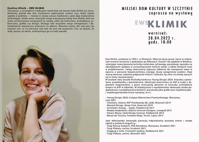 Na czwartek, 28 kwietnia zaplanowano w Miejskim Domu Kultury w Szczytnie otwarcie wystawy EWE KLIMIK (Eweliny Klimik). Początek wydarzenia godz. 18. Wstęp wolny.
