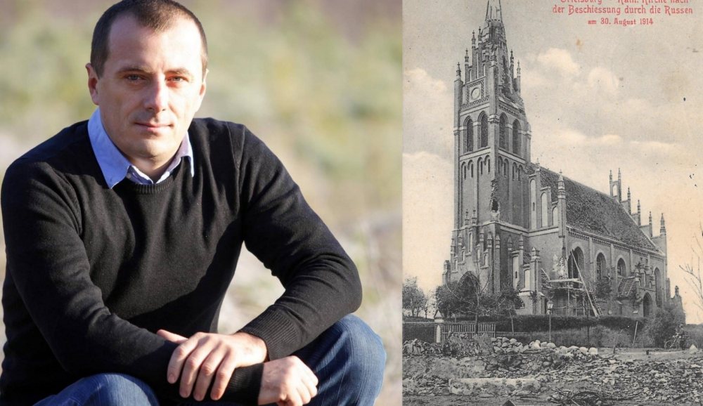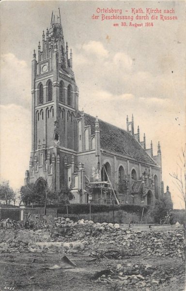 Uszkodzony pod koniec sierpnia 1914 roku kościół katolicki w Szczytnie.