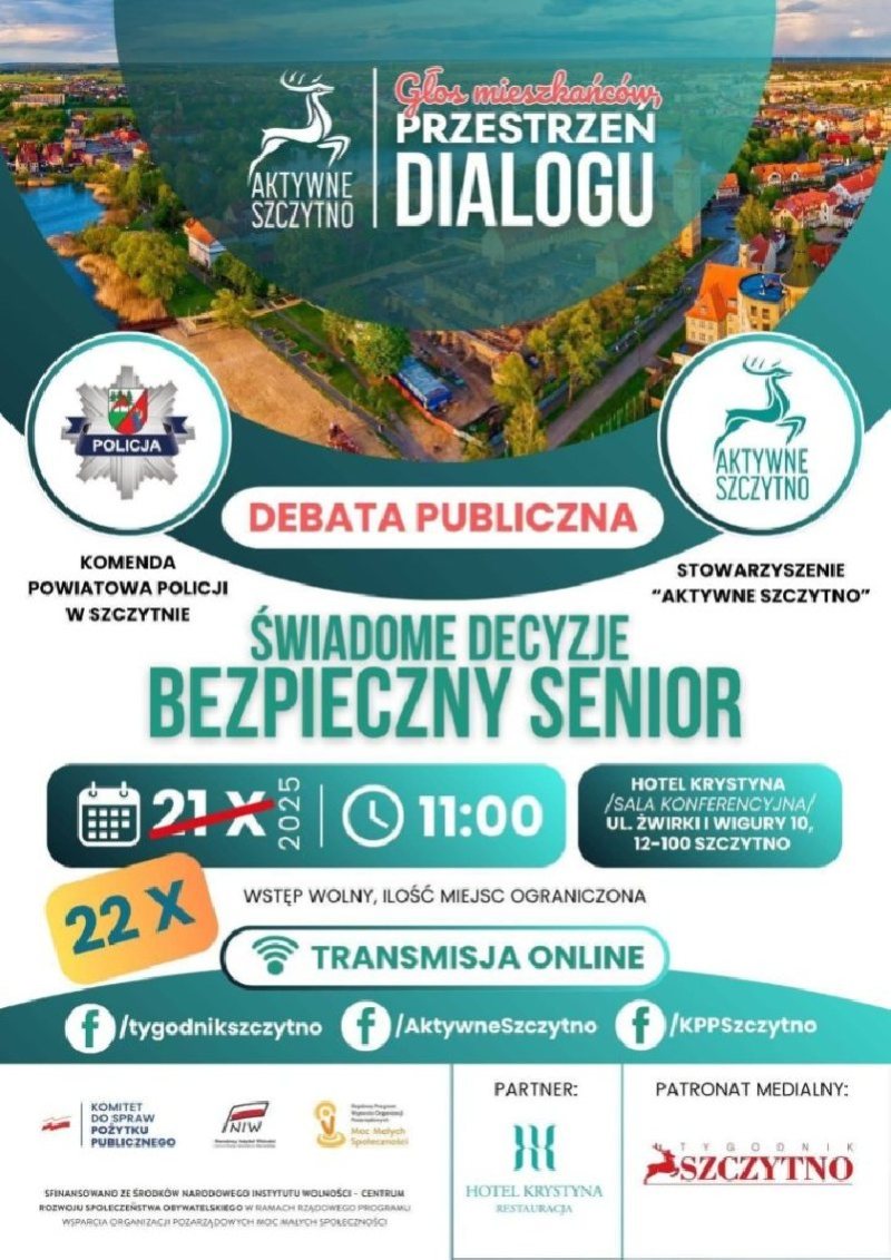 Komenda Powiatowa Policji w Szczytnie i Stowarzyszenie Aktywne Szczytno zapraszają mieszkańców na debatę publiczną „Świadome decyzje – Bezpieczny Senior”, która odbędzie się we wtorek, 22 października o godz. 11:00 w Hotelu Krystyna przy ul. Żwirki i Wigury 10 w Szczytnie.