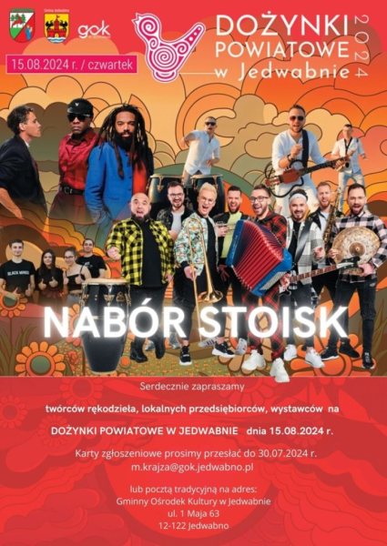 15 sierpnia 2024 r. na Stadionie Sportowym w Jedwabnie odbędą się "Dożynki Powiatowe". To doskonała okazja, aby pokazać swoje produkty, nawiązać nowe kontakty i cieszyć się wyjątkową atmosferą lokalnego święta.