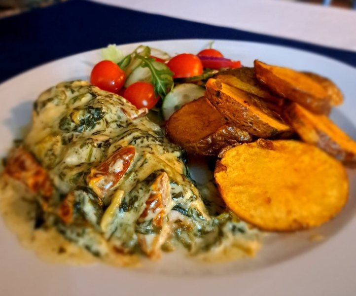 Restauracja mieści się przy ul. Polska 33a. Rezerwacje: tel. 89 624 39 65, więcej informacji na www.niebieskizaulek.pl. Smacznego!