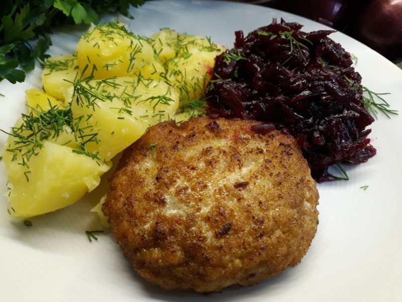 Kotlet mielony z ziemniakami (gotowanymi lub opiekanymi) i surówką,