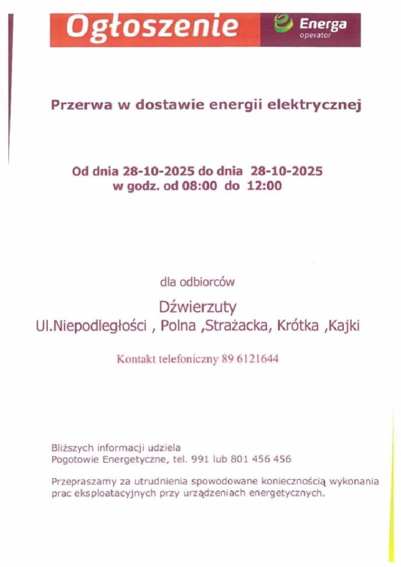 W razie pytań mieszkańcy mogą kontaktować się z biurem obsługi pod numerem 89 612 16 44 lub z Pogotowiem Energetycznym – tel. 991 i 801 456 456.