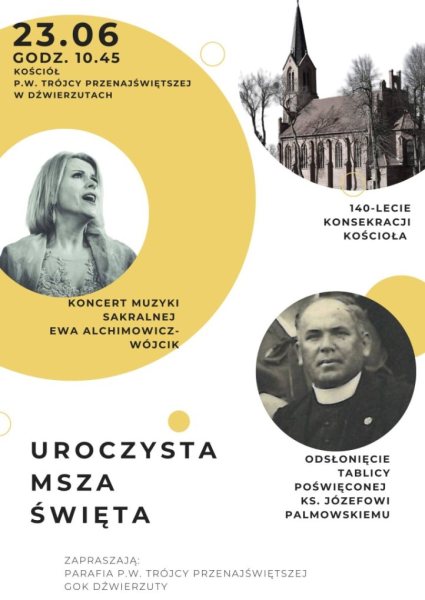 O godzinie 10:45 w kościele katolickim pw. Trójcy Przenajświętszej odbędzie się uroczysta msza święta. Po mszy zostanie odsłonięta tablica poświęcona pamięci ks. Józefa Palmowskiego, który był proboszczem w Dźwierzutach w latach 1918-1920. Ks. Palmowski zasłynął swoją działalnością propolską podczas plebiscytu w 1920 roku, za co był prześladowany i ostatecznie zamordowany w Dachau w 1945 roku.