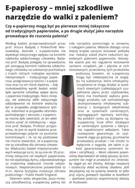 Według badań, przeprowadzonych przez prof. Artura Badydę z Politechniki Warszawskiej, ekstrakt z e-papierosów nie wywołuje toksycznego wpływu na komórki nabłonka oddechowego człowieka. Badania prof. Badydy polegały na sprawdzeniu jak zareagują komórki nabłonka oddechowego człowieka na substancje pochodzące z trzech różnych rodzajów wyrobów nikotynowych - tradycyjnego papierosa, podgrzewacza tytoniu i e-papierosa oraz na ich różne stężenia.