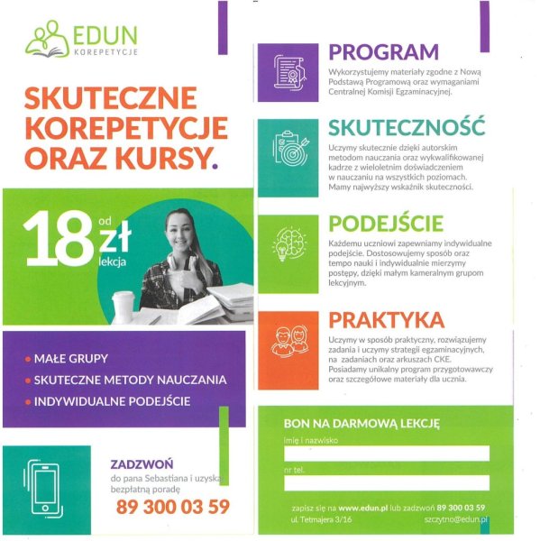 Edun Korepetycje Szczytno to lokalna firma, którą kieruje Sebastian Kucharski. Specjalizuje się w korepetycjach dla uczniów szkół podstawowych i średnich. Pan Sebastian skupił w swojej firmie korepetytorów z pasją do nauki. Efekty? Ich uczniowie w 2020 roku mieli 100 procent zdawalności egzaminów szkolnych, w tym też matur. - Wyniki naszych uczniów to nasza najlepsza wizytówka – mówi z uśmiecham pan Sebastian.