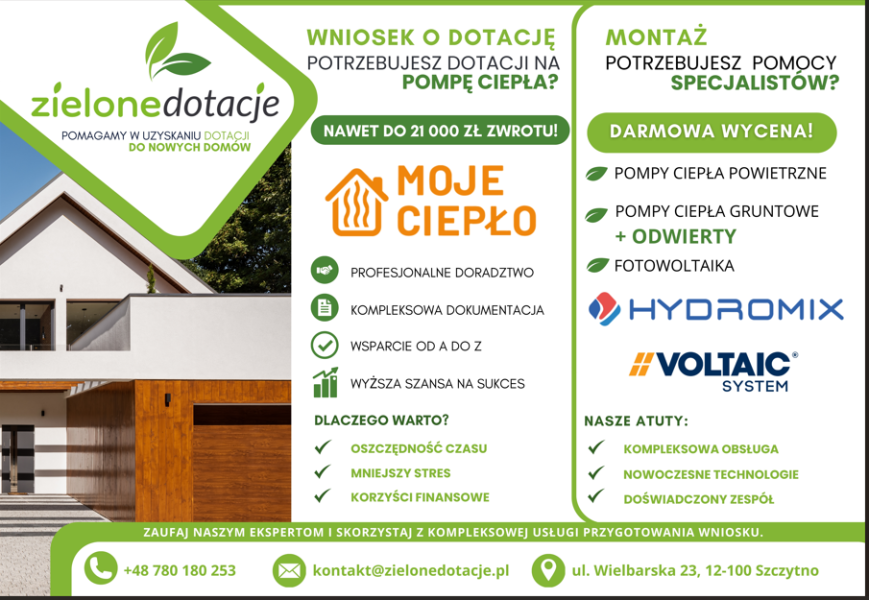 „Zielone Dotacje” to młoda, dynamiczna marka, która łączy lata doświadczenia wypracowane w ramach lokalnego przedsiębiorstwa Hydromix z nowoczesnym podejściem do ekologicznych technologii. Firma specjalizuje się w pozyskiwaniu środków z rządowych programów takich jak Czyste Powietrze, Mój Prąd czy Moje Ciepło.