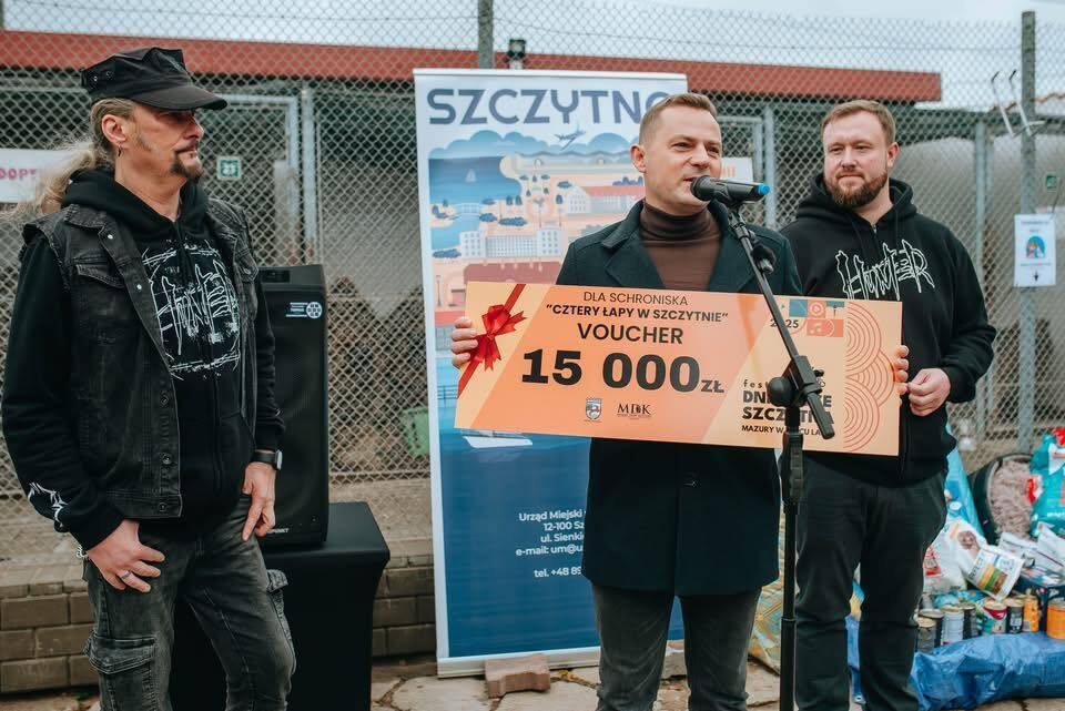 Muzyka, zabawa i… konkretna pomoc. Podczas Dnia Otwartego schroniska „Cztery Łapy” burmistrz Stefan Ochman przekazał na ręce pracowników symboliczny czek o wartości 15 tysięcy złotych. Pieniądze pochodzą z części dochodu ze sprzedaży biletów podczas tegorocznego festiwalu Dni i Nocy Szczytna.