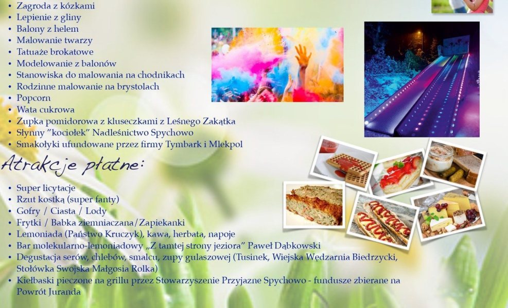 Na uczestników czekają smakołyki, takie jak gofry, ciasta, lody, frytki oraz regionalne specjały. W programie są również licytacje, konkursy i różnorodne gry. Festyn zakończy się kolorowym festiwalem Holi oraz uruchomieniem armatek wodnych przez OSP Spychowo.