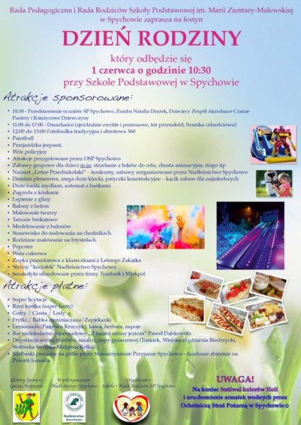 Organizatorami Dnia Rodziny są Rada Pedagogiczna i Rada Rodziców Szkoły Podstawowej im. Marii Zientary-Malewskiej w Spychowie, we współpracy z Nadleśnictwem Spychowo. Wydarzenie ma na celu integrację społeczności lokalnej oraz zapewnienie niezapomnianych wrażeń dla wszystkich