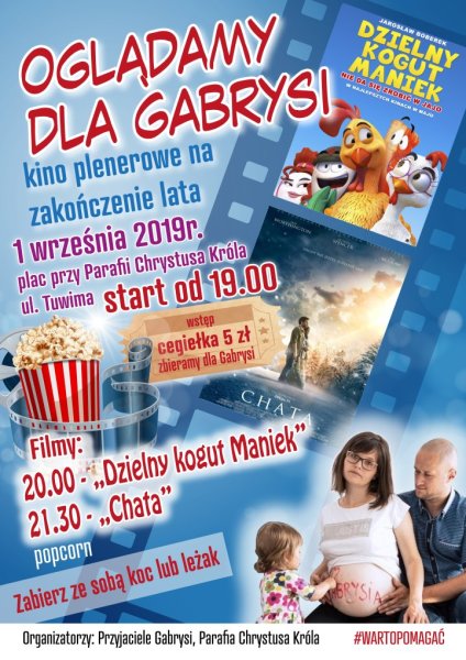 Dla dzieci „Dzielny kogut Maniek” oraz dla dorosłych „Chata” - to dwa filmy, które będzie można obejrzeć w kinie plenerowym na placu przy kościele pw. Chrystusa Króla przy ul. Tuwima. Emisja odbędzie się w niedzielę, 1 września. Początek – godz. 20. Pomysłodawcami wydarzenia są miejscy radni Rafał Kiersikowski i Waldemar Zimny.
